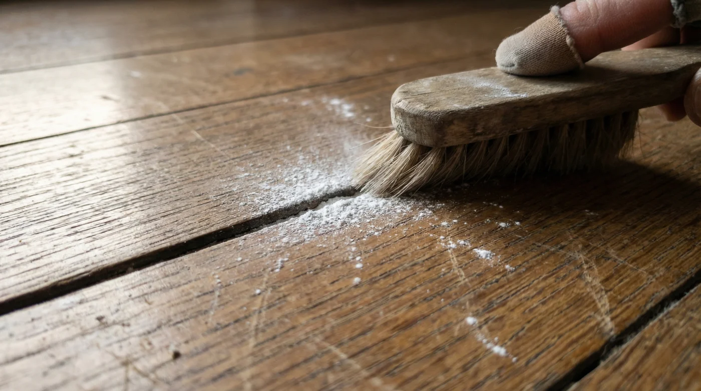 Laminat Parkeler İçin Sabır: Laminatların fabrikasyon birleşim yerleri inanılmaz derecede incedir. Boşluklar gözle zar zor görülür. Bu yüzden pudrayı döktükten sonra, eski bir kredi kartı veya ince sert bir kağıt kullanarak tozu o incecik çizgilere nazikçe itmelisin. Yüzeydeki fazlalığı anında silip atmak yerine, gece boyunca o mikro çatlaklara iyice yerleşmesine müsaade et.