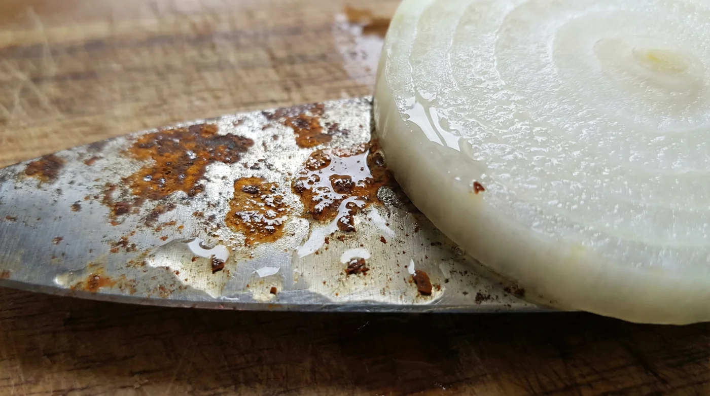 Karbon çelik tutkunları için durum biraz daha hassastır. Bu bıçaklar inanılmaz keskindir ama neme karşı çok kırılgandır. Eğer pas henüz ince bir toz gibiyse, soğanın taze kesilmiş yüzeyini doğrudan lekenin üzerine sürtmen yeterlidir. Soğanın suyu, karbonun o koyu gri patinasına dokunmadan sadece aktif pası eritecektir.