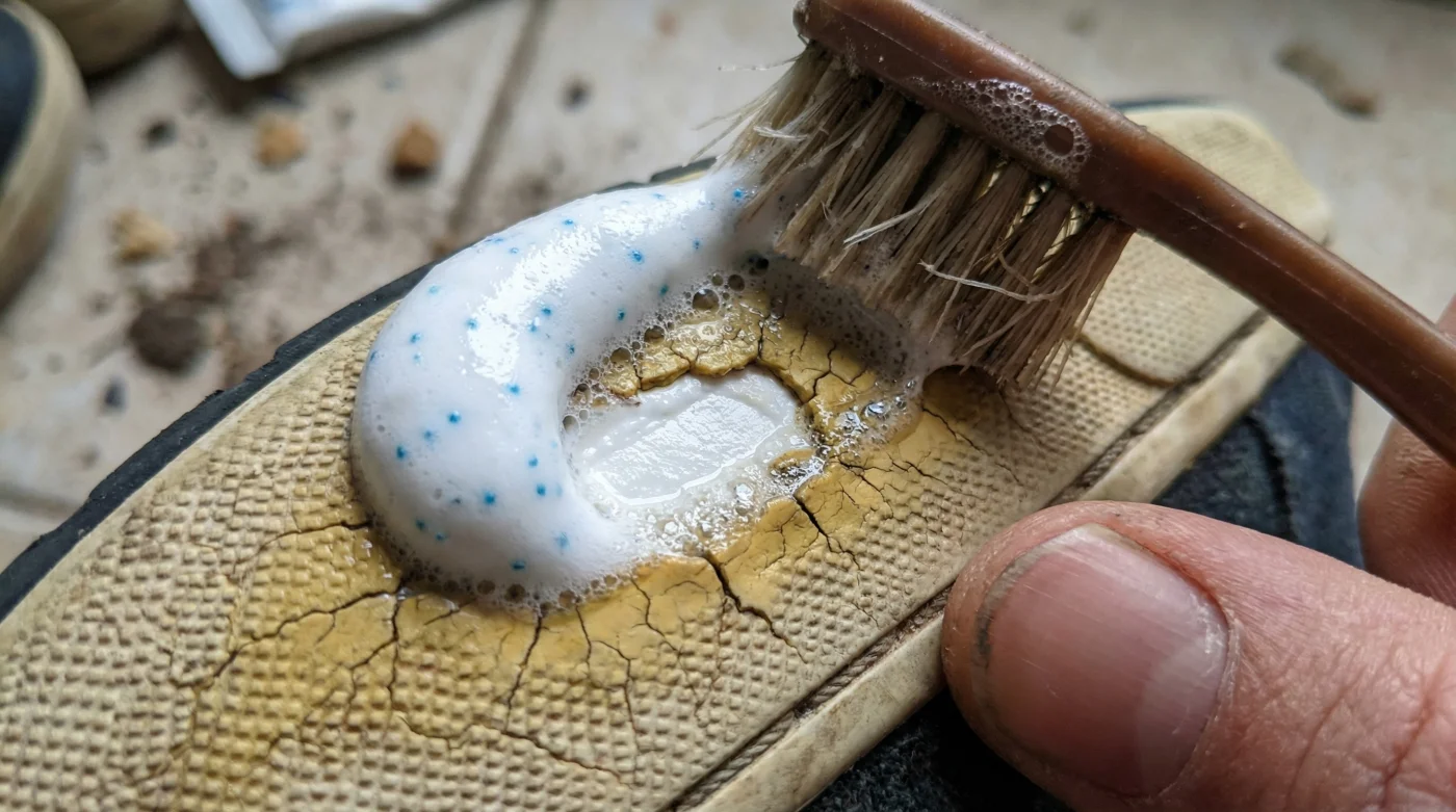 - Hazırlık: Ayakkabının tabanındaki kaba tozu nemli bir bezle al.