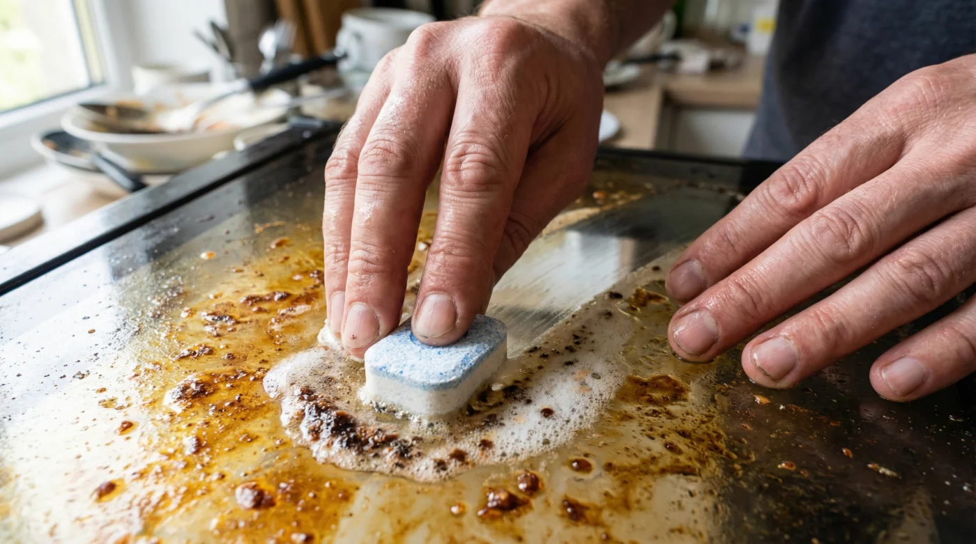 Şimdi o kalın eldivenleri ve ağır spreyleri dolabın en arkasına it. İhtiyacın olan tek şey, ortası jel olmayan, en sıradan, sert preslenmiş toz formundaki bir bulaşık tableti ve yarım kase ılık su. Fırının fişini çek ve kapağını tamamen açık, yere paralel yatay bir konuma getir. Yerçekimi artık senin düşmanın değil, yardımcın olacak.
