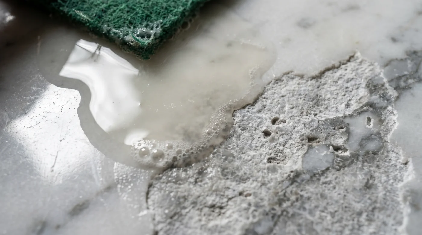 Limon, sirke ve karbonat üçlüsü ev temizliğinin masum standartları gibi pazarlanır. Ancak bu asidik bileşenleri kalsiyum karbonat bazlı bir doğal taşa uygulamak, ipek bir gömleği akü asidiyle yıkamaya benzer. Mermer tezgahların fabrikadan çıkarken üzerlerine uygulanan o şeffaf, suyu iten koruyucu akrilik cila tabakası, pH değeri 7’nin altındaki her maddeyle şiddetli bir reaksiyona girer. Asit, cilanın polimer bağlarını saniyeler içinde parçalar ve doğrudan taşın yapısındaki kalsiyumu çözerek korozyon dediğimiz geri döndürülemez mat lekeleri oluşturur.