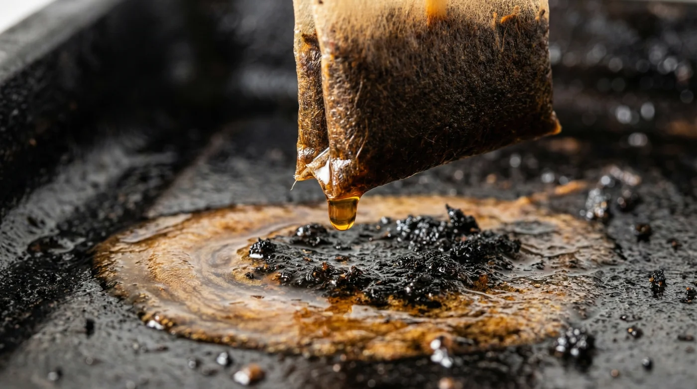 Tannik asit, çay demlenirken suya o buruk tadı ve koyu rengi veren maddedir. Ancak yağ ve yanık karbonla karşılaştığında, bu buruk madde adeta bir moleküler makas gibi çalışır. Yanık katmanların yüzeyle kurduğu inatçı bağları tek tek, sessizce kesip atar. Sen sadece yorgunluğunu atıp dinlenirken, çay poşeti o görünmez ağır işçiliği üstlenir.
