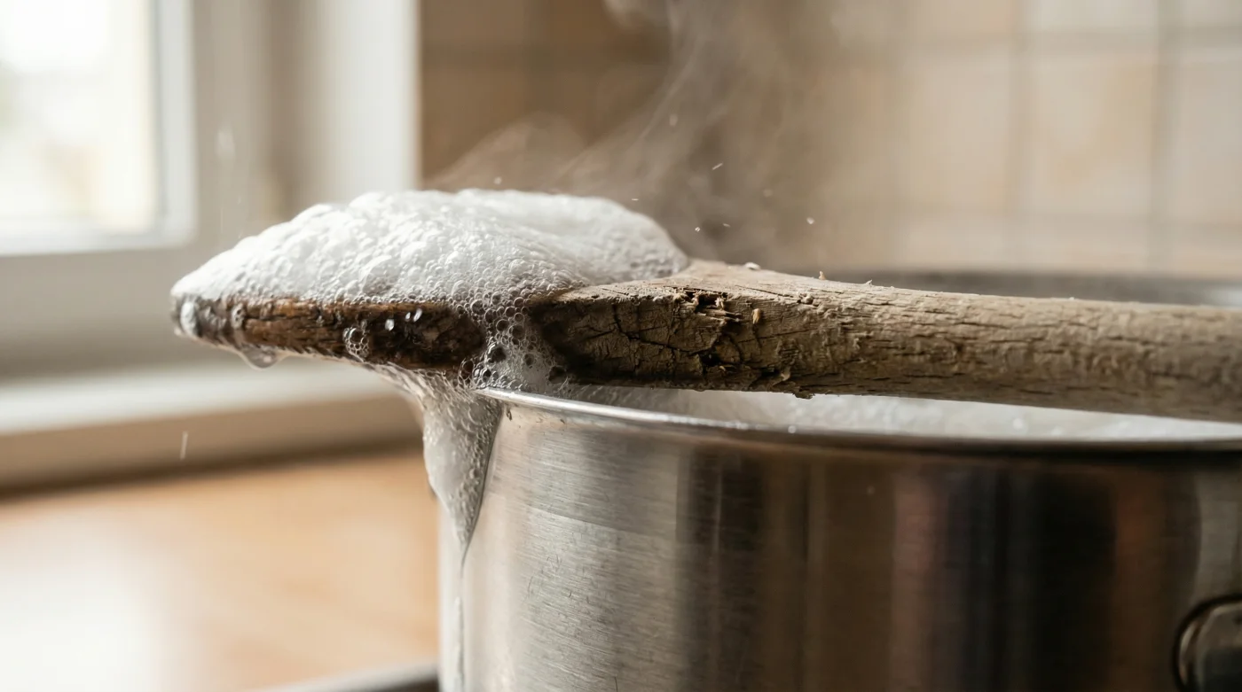 Şişkin köpükler tahta kaşığın o pürüzlü ve kuru yüzeyine çarptığında, mikroskobik iğnelere çarpmış balonlar gibi patlarlar. Tahtanın nispeten serin olan yüzeyi, buharın anında yoğunlaşmasını sağlar ve köpüğün o gergin zarını yırtar. Sadece eski bir mutfak alışkanlığını sürdürmüyor, termodinamiği kendi lehine çeviriyorsun.