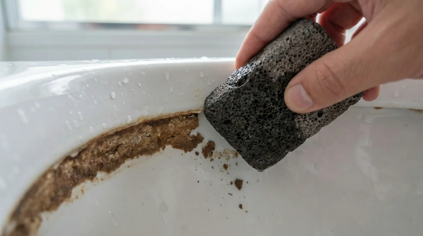 Temizlikte gerçek ustalık, yüzeye zarar vermeden kiri ikna edebilmektir; ponza taşı, suyu kullanarak kireci porselenden nazikçe ayırır.