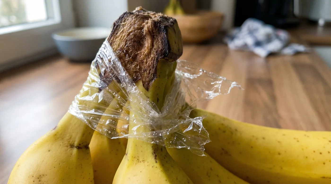 Muzları serbestçe bir kasede bırakmak, onların çok hızlı bir şekilde olgunlaşıp çürümesine neden olan en büyük hatadır. Muzlar, sap kısımlarından doğal olarak ‘etilen gazı’ salgılar. Bu gaz, meyvenin geri kalanına ve hatta çevresindeki diğer meyvelere yayılarak yaşlanma ve çürüme sürecini inanılmaz derecede hızlandırır. Sadece ufak bir dokunuşla bu yaşlanma sürecini izole edebileceğinizi biliyor muydunuz?