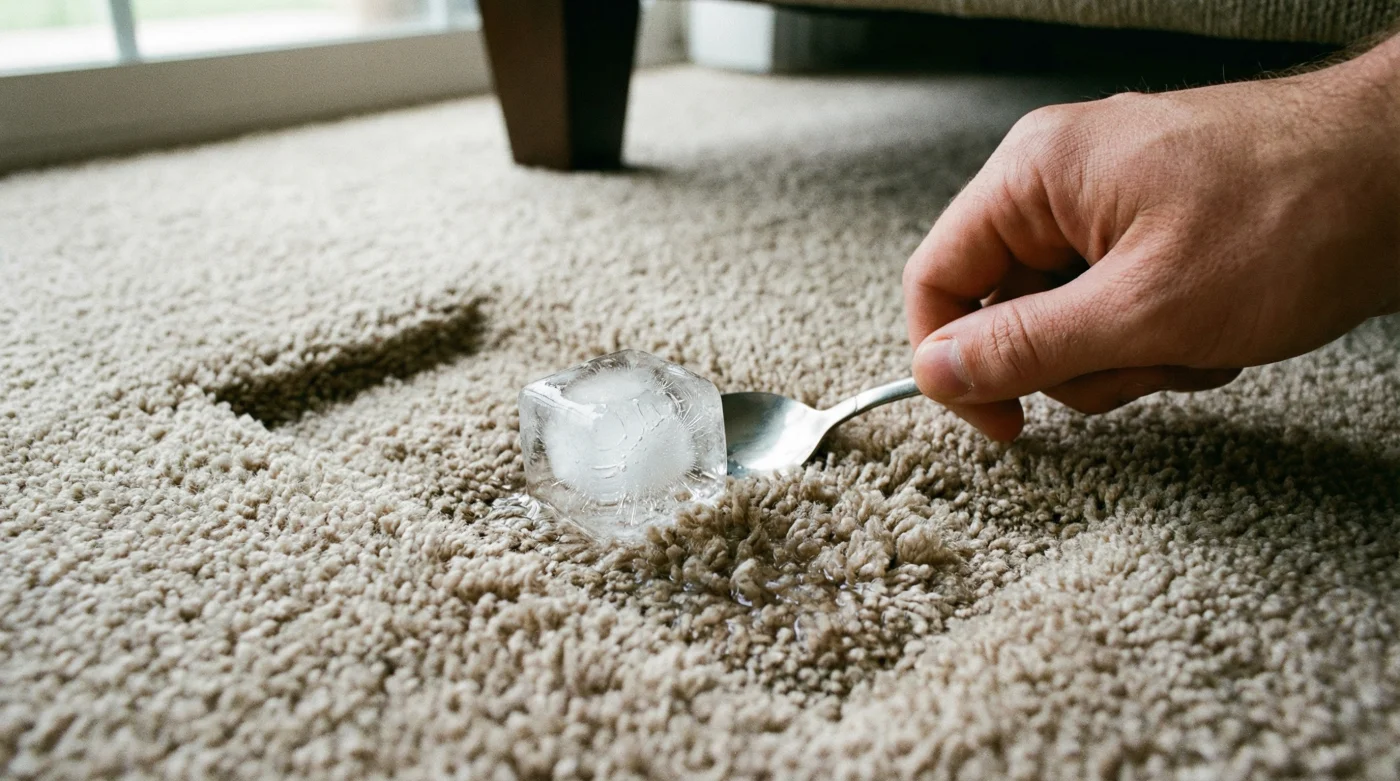 Bu yöntem, agresif bir temizlik hamlesinden ziyade bir tür yavaş terapi seansıdır. İhtiyacın olan tek şey buzluktan çıkaracağın standart bir buz küpü ve mutfak çekmecenden alacağın sıradan bir yemek kaşığı. Ezilmiş çukurun tam ortasına buz küpünü bırak. Eğer iz çok genişse, yan yana birkaç küp dizebilirsin. Ardından onu kendi haline bırak; izlemen veya müdahale etmen gerekmiyor. Ortalama oda sıcaklığında, yaklaşık 20-22 derecede, o buz kendi yavaş ritmiyle eriyecektir.