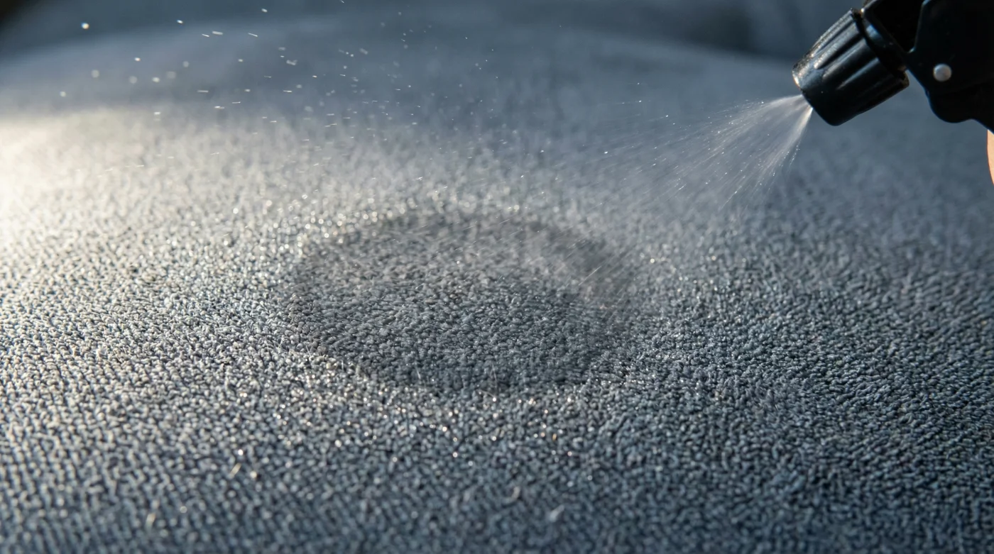 Lekeli bölgeye alkolü hafifçe püskürt. Hedefin kumaşı sırılsıklam etmek değil, yüzeyde ince bir sis tabakası oluşturmaktır. Kumaşın üzerindeki o koyu halkanın hafifçe nemlendiğini göreceksin.