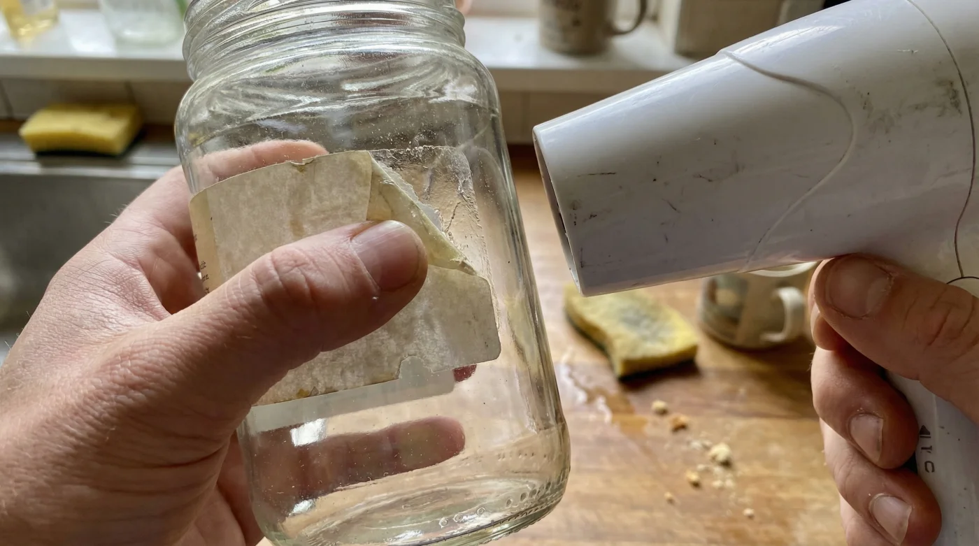 Sen sıcak havayı şerit halinde ilerlettikçe, kağıdın altındaki inatçı yapıştırıcı erimeye devam edecektir. Etiketi tek bir büyük parça halinde, hiç yırtılmadan ve parçalanmadan camdan ayırmanın verdiği o tuhaf tatmin hissini yaşayacaksın. İşlem bittiğinde arkada hiçbir oje çıkarıcıya, zeytinyağına veya jiletle kazımaya ihtiyaç duyacak yapışkan izi kalmadığını göreceksin. Saniyeler içinde, pırıl pırıl, sterilize edilmeye hazır bir cam kavanoza sahip oldun.