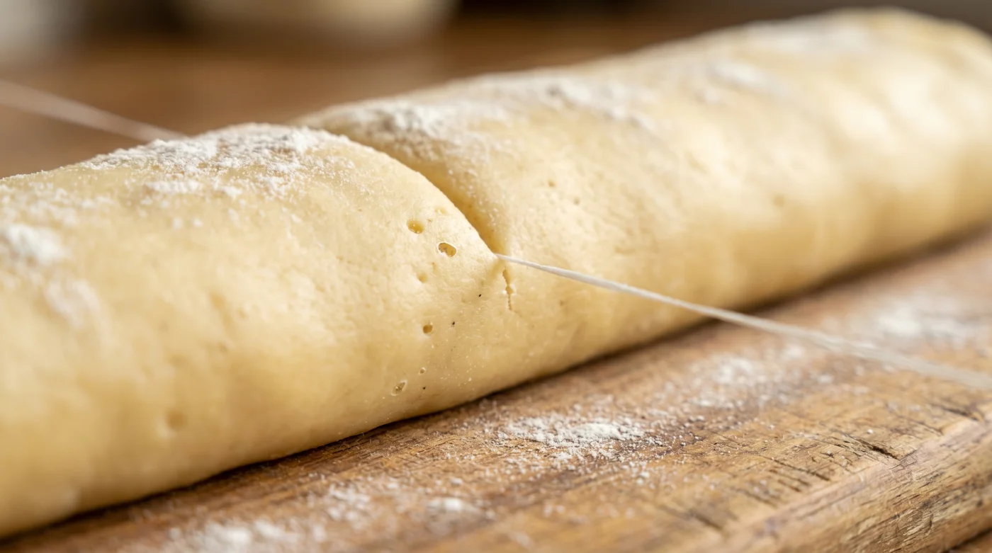 İşte bu noktada bakış açını tamamen değiştirmen gerekiyor. Çözüm, hamuru kesmek değil, onu ip gerilimi kullanarak kendi içinden nazikçe ayırmaktır. Düz bir diş ipi, hamurun etrafını sarıp iki uçtan çekildiğinde, aşağı doğru değil, doğrudan merkeze doğru eşit bir kesme kuvveti uygular.