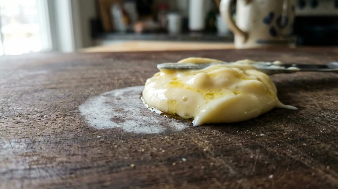 Bu noktada panik yapmayı bırakıp buzdolabını açman ve en sıradan malzemelerden birini, mayonezi çıkarman gerekiyor. Beyaz halkanın üzerine yaklaşık bir iki milimetre kalınlığında, lekeyi tamamen örtecek cömert bir tabaka mayonez sür. Eğer leke sandalyenin bacağı gibi dikey bir yüzeydeyse, mayonezin akmaması için üzerine ince bir kağıt havlu kapatabilirsin. Mayonez, mutfağında sadece bir sos olarak bekliyor gibi görünse de, ahşabın üzerinde muazzam bir kurtarıcıya dönüşür.