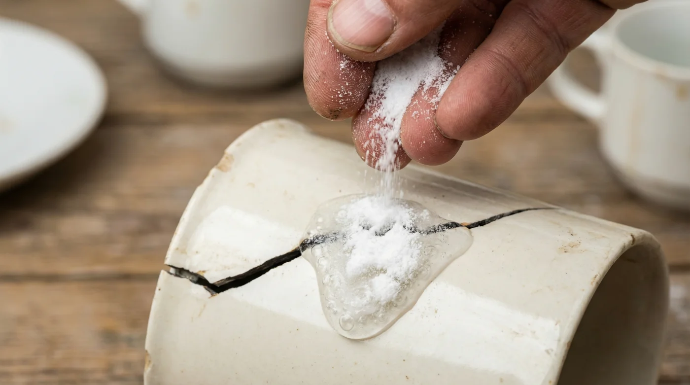 Bu teknik, sıvı ve tozun bir araya geldiği anlık bir sihirdir. Kırık parçaları önce kuru kuruya birbirine oturt. Eğer arada kaybolmuş küçük bir porselen yongası varsa, boşluğu dert etme. Kırığın olduğu çizgiye dikkatlice süper yapıştırıcıyı damlat. Hemen ardından, henüz sıvı ıslakken üzerine ince bir tabaka karbonat serp. O an göreceğin şey kimyanın ta kendisidir.