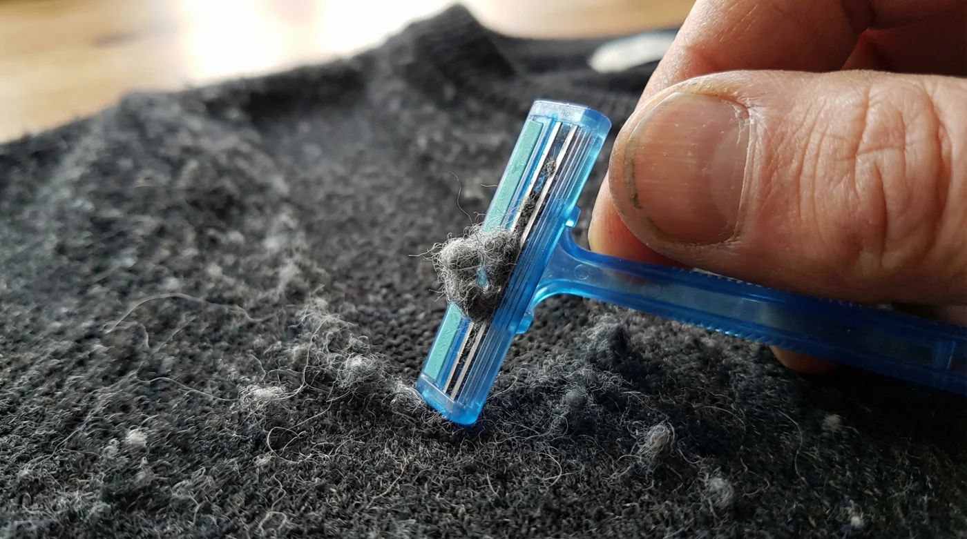 Uygulama sandığından çok daha kolay ve meditatif bir süreçtir. Kazağını düz, sert ve iyi aydınlatılmış bir masanın üzerine ser. Kumaşın kırışık olmamasına dikkat et; bir elinle kazağı hafifçe gerdirerek düz bir yüzey oluştur. Diğer eline, losyon bandı olmayan, en basit iki veya üç bıçaklı tıraş bıçağını al. Bıçağı kumaşa çok hafif bir açıyla, neredeyse paralel olacak şekilde yerleştir.