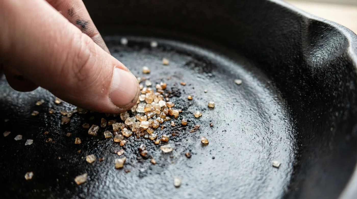 İşte tam bu noktada, o simsiyah yüzeyin üzerinde beyaz bir kurtarıcı belirir: Kaba tuz. Kimyasal bir çözücüye değil, basit ve saygılı bir fiziksel aşındırıcıya ihtiyacın var. Kaba tuz, demirin doğal ağırlığıyla uyum içinde çalışarak sadece oraya ait olmayanları uzaklaştırır.