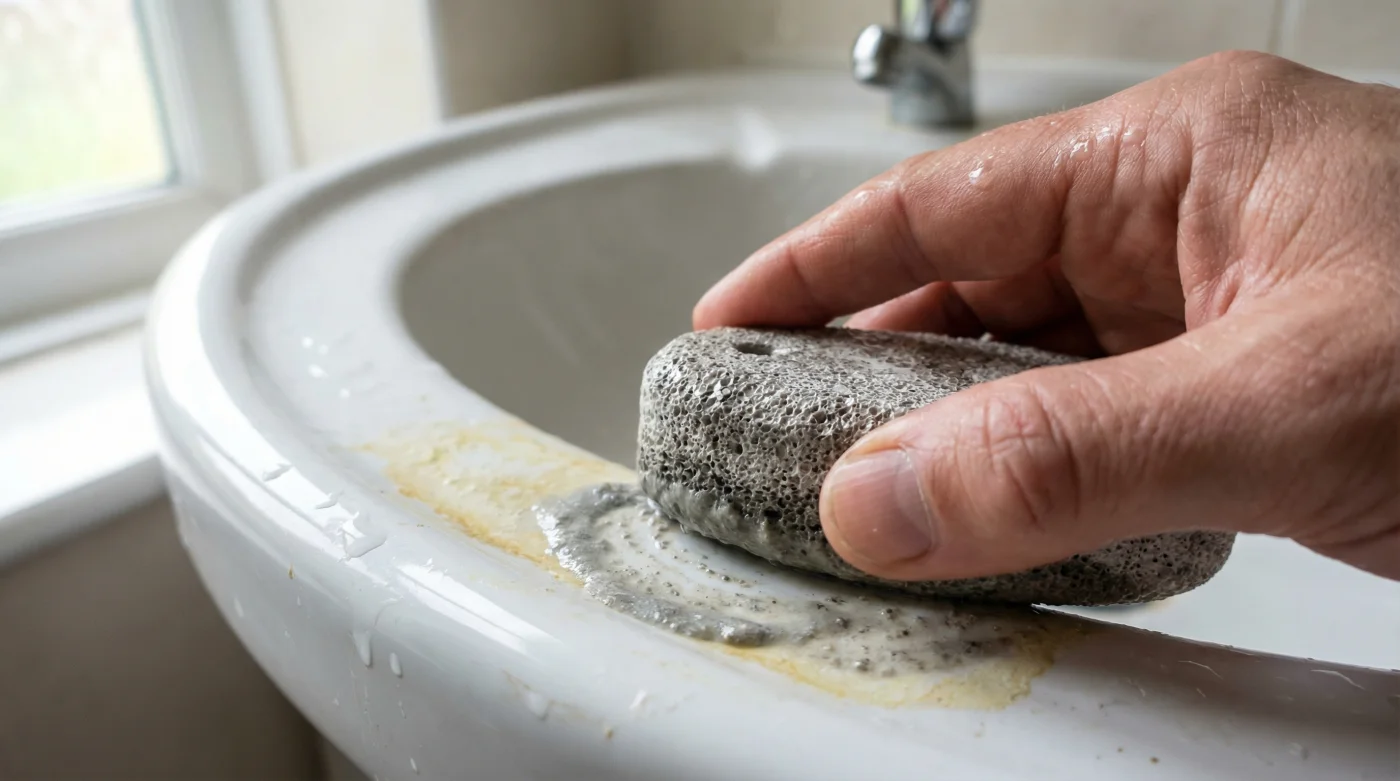 Eski bir binada yaşıyorsan ve su tesisatın yılların kalsiyum yükünü taşıyorsa, klozetindeki o halka muhtemelen kalın ve koyu renklidir. Senin yapman gereken, ponza taşını en az on dakika kaynar olmayan sıcak suda bekletmektir. Isınan su, taşın gözeneklerini tamamen doldurur ve sürtünme sırasında mikroskobik bir çamur tabakası yaratarak kireci yumuşatır. Bu senin en güçlü mekanik avantajın olacak.