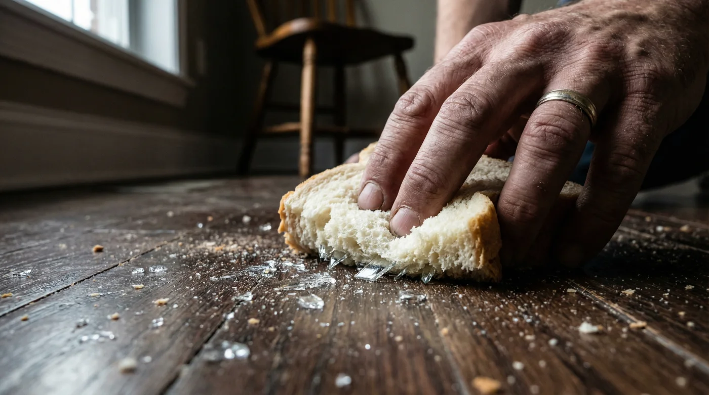 Taze ekmek diliminin gözenekli, esnek ve hafif nemli yapısı, bir mıknatıs gibi cam kırıklarını kendine çeker ve hapseder. Güce karşı güç kullanmak yerine, bu yumuşak süngeri kullanarak tehlikeyi kucaklarsın. Tıpkı bir yastığın içine gömülen ağır bir nefes gibi, o incecik cam tozları hamurun elastik yapısına saplanır ve bir daha asla dışarı çıkamaz.