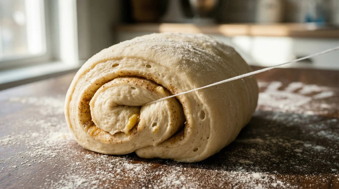 Bu basit fiziksel yaklaşım, hamurun en büyük zaafı gibi görünen yumuşaklığını ve esnekliğini senin en güçlü avantajına dönüştürür. Bıçağın sürtünmeyle yapıştırdığı ve bozduğu o ince hamur katmanları, ipin altından bir nefes gibi kayıp geçerken hiçbir zarar görmez. İçine sürdüğün tereyağlı ve tarçınlı dolgu, olduğu yerde kalır; dışarı fışkırmaz veya hamurun dış yüzeyine bulaşmaz. Bu, malzemenin doğasına saygı duyan, sessiz ama son derece etkili bir müdahaledir.