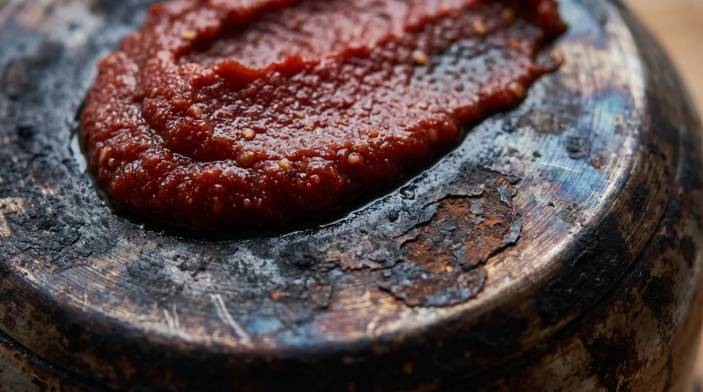 - Katmanlama: Marketten alacağınız ucuz, katkısız bir domates salçasından bol miktarda alın. Yanık bölgenin üzerine, metalin gri rengini tamamen kapatacak kalınlıkta (yaklaşık 2-3 milimetre) spatula veya bıçak sırtıyla sürün.