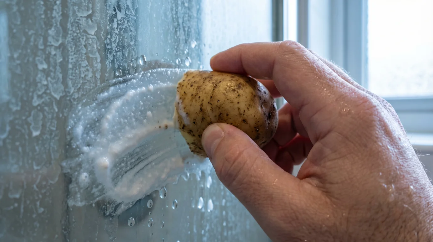 Soğuk, taze kesilmiş bir patatesin ortasından tuttuğunuzu düşünün. Bıçağın çıkardığı o keskin kıtırlık sesi ve nemli banyo havasına karışan hafif topraksı koku doğrudan genzinize doluyor. Islak, nişastalı yüzeyi duşakabinin kalsiyum lekeleriyle matlaşmış camına sürtüyorsunuz. Alışkın olduğunuz o geniz yakan çamaşır suyu kokusu yok; sadece hafif bir sürtünme sesi, kurumuş kirecin mikroskobik çıkıntıları üzerinde kayan yoğun sebze dokusunun fısıltısı var. Nişasta, camda süt rengi, neredeyse görünmez ince bir tabaka bırakıyor. Sabun ve buhar dolu bir alanda elinizde bir yiyecek parçası tutmak başlangıçta mantıksız hissettiriyor. Ancak su bu işlem görmüş cama çarptığında, damlalar iz bırakarak aşağı süzülmüyor; anında boncuklaşıp sekiyor ve hiçbir kireç tortusu bırakmadan akıp gidiyor.